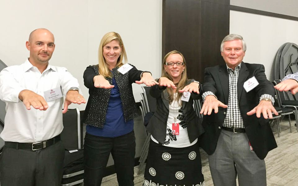 In the team building activity School Supply Scramble, groups compete to earn backpacks and supplies to donate to a children’s charity.